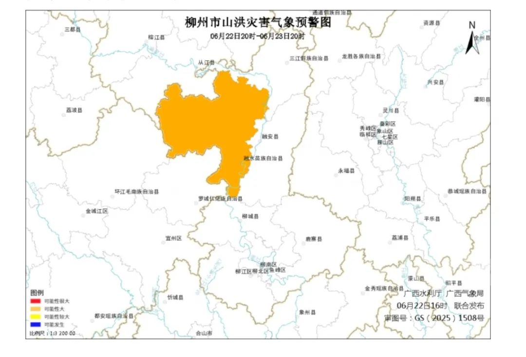 广西水利厅和广西气象局于6月22日16时联合发布山洪灾害气象预警:预计6月22日20时至6月23日20时,融水苗族自治县可能发生山洪灾害,其中融水苗族自治县发生山洪灾害可能性大(橙色预警)。请各影响区注意做好监测、巡查、预警和转移避险等山洪灾害防范工作。