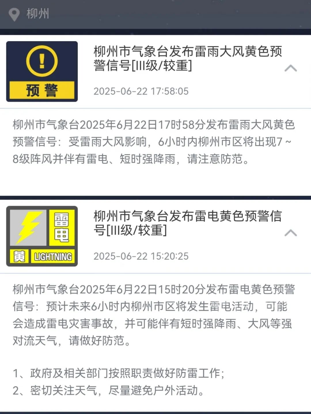 22日17时58分,气象部门发布雷雨大风黄色预警信号:受雷雨大风影响,6个小时内柳州市区将出现7~8级阵风并伴有雷电、短时强降雨,请注意防范。